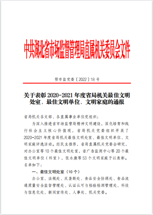 2020-2021 年(nián)度省局機關(guān)最佳文明 處(chu)室、最佳文明(ming)單位、文明家(jiā)庭