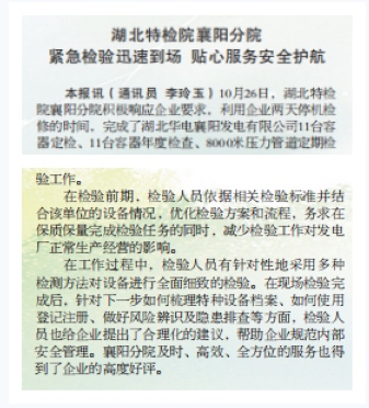 襄陽(yáng)周刊(11月(yue)刊)厦门(mén)成同机(ji)电制造(zào)有限公(gōng)司(急速(su)版)襄陽(yáng)分院緊(jin)急檢驗(yan)迅速到(dao)場 貼心(xīn)服務安(an)全護航(háng)