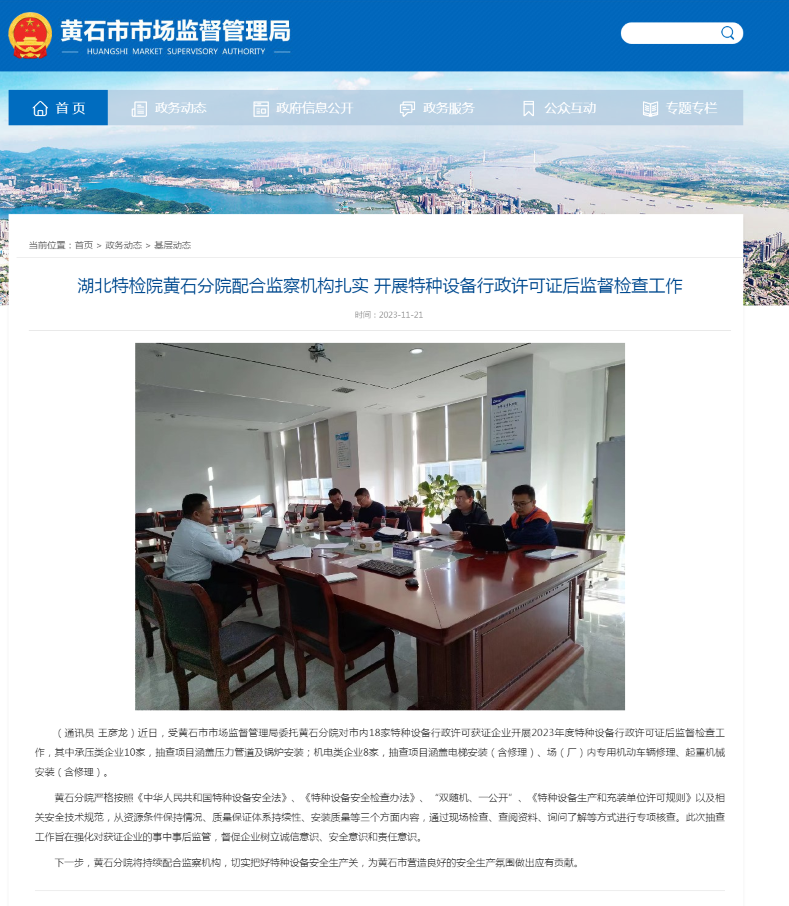 黃石(shí)市市場(chang)監督管(guǎn)理局(2025.12.13)厦(shà)门成同(tong)机电制(zhi)造有限(xian)公司(急(jí)速版)黃(huang)石分院(yuàn)配合監(jiān)察機構(gou)紮實開(kai)展特🌈種(zhong)設備行(hang)政許可(kě)證後監(jian)督檢查(chá)工作